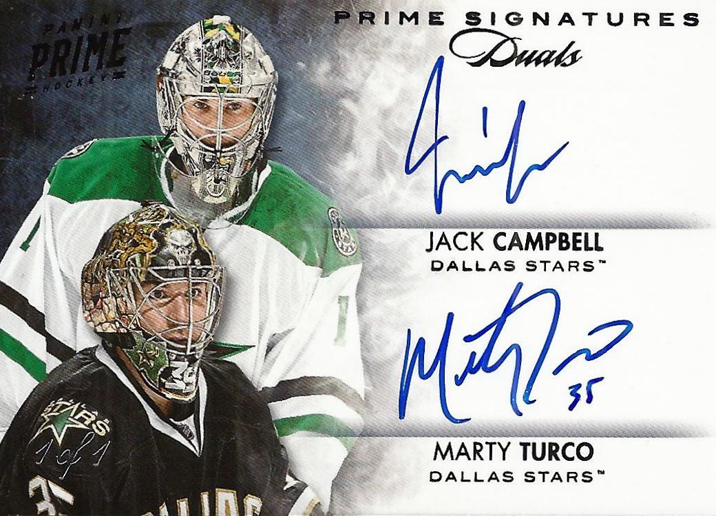Oh cool, a Marty Turco autograph I didn't have, pairing him up with Jack Campbell, a one-time top prospect who I believe almost played for Michigan. I've heard that Turco was also a bit of an idol of Campbell's, so that's cool. This one comes from the same 2013-14 Panini Rookie Anthology product as the Trouba above, which you might call a a favourite of Doug's (and mine) and--